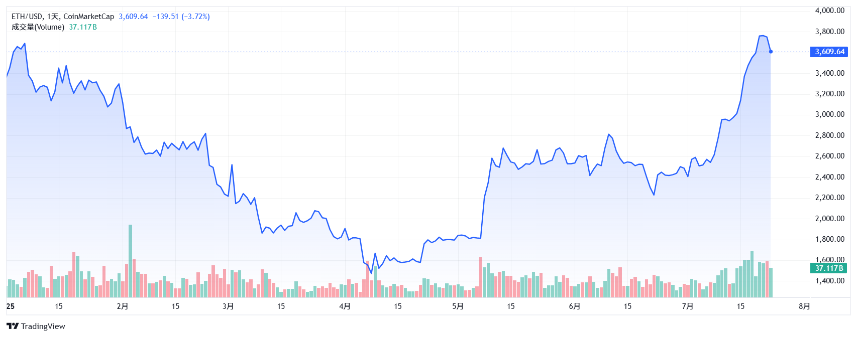加密货币市场虽然大饼目前在高位上震荡,止住了上涨的势头,目前在11.7万美元左右,但是回头一看,老二 ETH 已经不知不觉一路来到3600美元左右了,我的印象中,这货还在2000左右,我记得在这个位置徘徊了很久。我跑去回看了一下数据,这货在今天4月份之前一直下跌,一直到四月中旬的1500左右,然后一路缓慢上涨,虽然在两千多的时候横盘了一个多月,之后这一个多月迅速突破。我对比了一下和比特币的走势图,老二 ETH 最近的曲线非常陡峭。